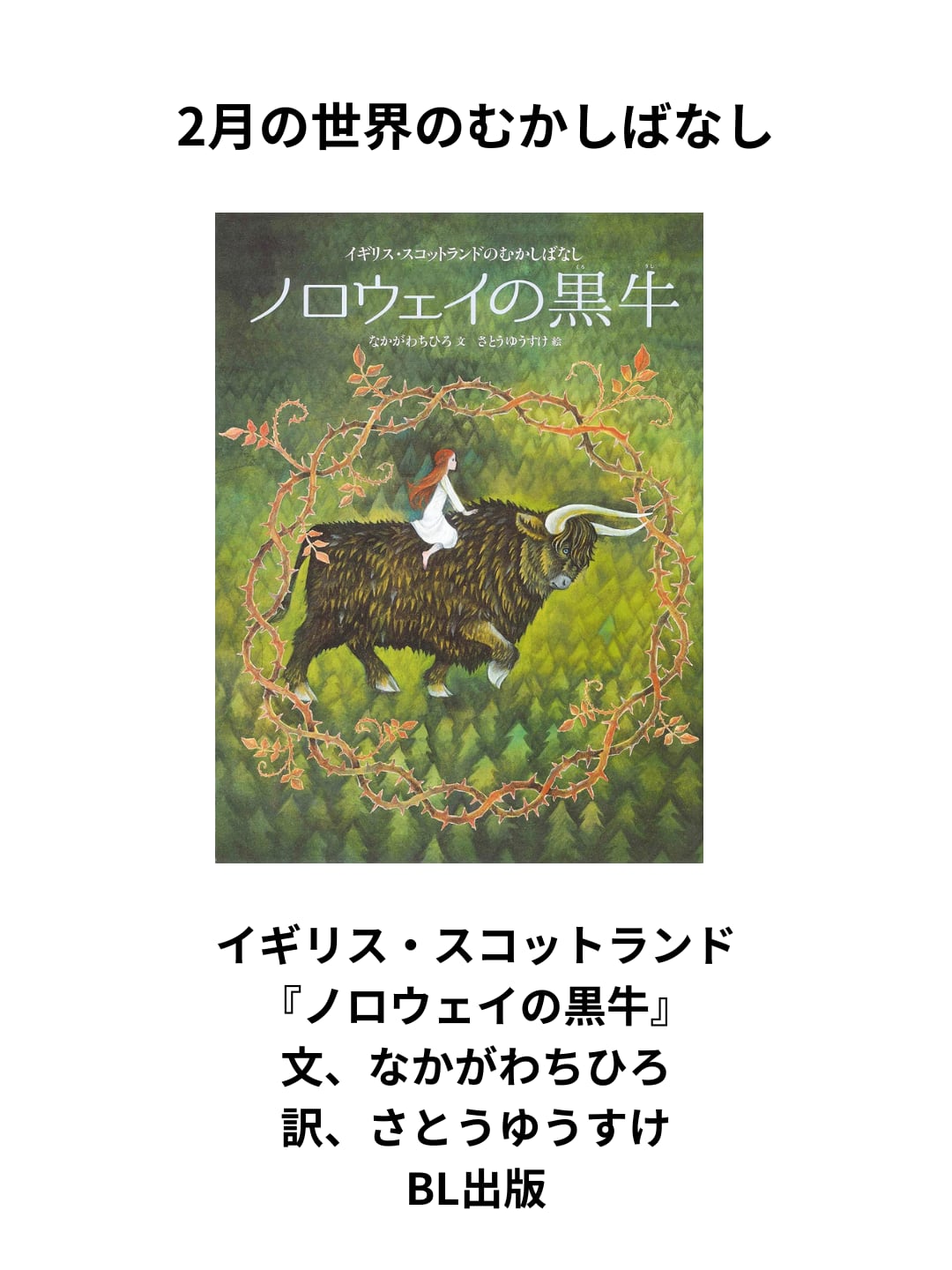 「身の毛もよだつ怪物といわれるノロウェイの黒牛と、その黒牛と結婚してもいいという娘のふしぎな恋。黒牛は、娘を背にのせ、果てしない旅にでます。黒牛にかけられた呪いはとけるのでしょうか・・・?」出版社ホームページより